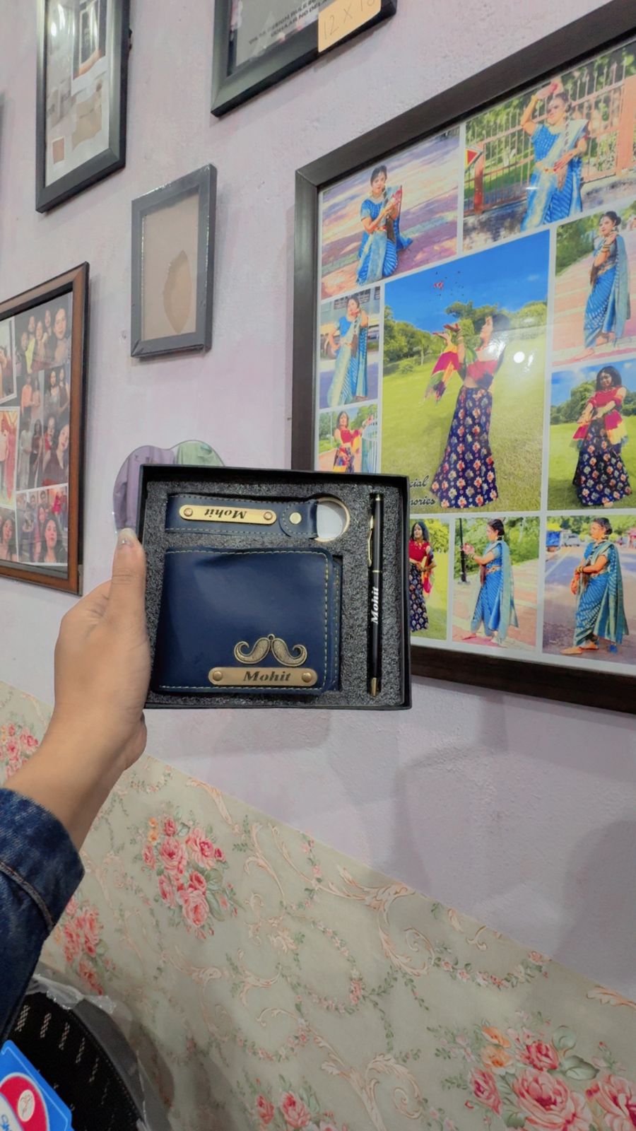 Contextual: A person holding up a customized men’s gift set containing a wallet, keychain, and pen inscribed with the name “Mohit”. The gift box is being held in front of a lightly colored wall decorated with several framed portraits.