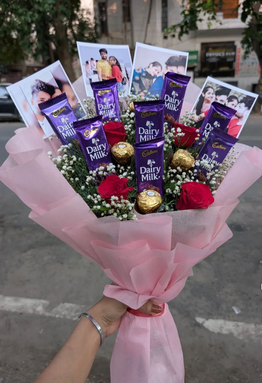 Apne special someone ko surprise karein is behad khoobsurat aur personalized bouquet ke sath! Yeh sirf ek sadharan bouquet nahi, balki aapke pyar ka ek meetha izhaar hai. Isme fresh laal gulab, premium chocolates aur aapki pyari yaadon (photos) ka ek perfect combination shamil hai, jo kisi ka bhi dil jeetne ke liye kafi hai.